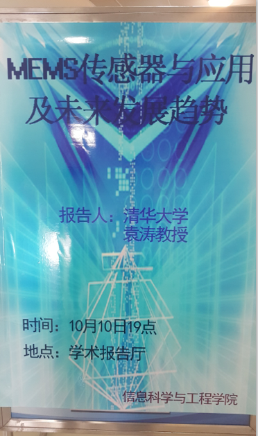 定于10月10号晚上7点,邀请清华大学袁涛教授做学术报告,题目:MEMS传感器与应用及未来发展趋势,报告地点学术报告厅。