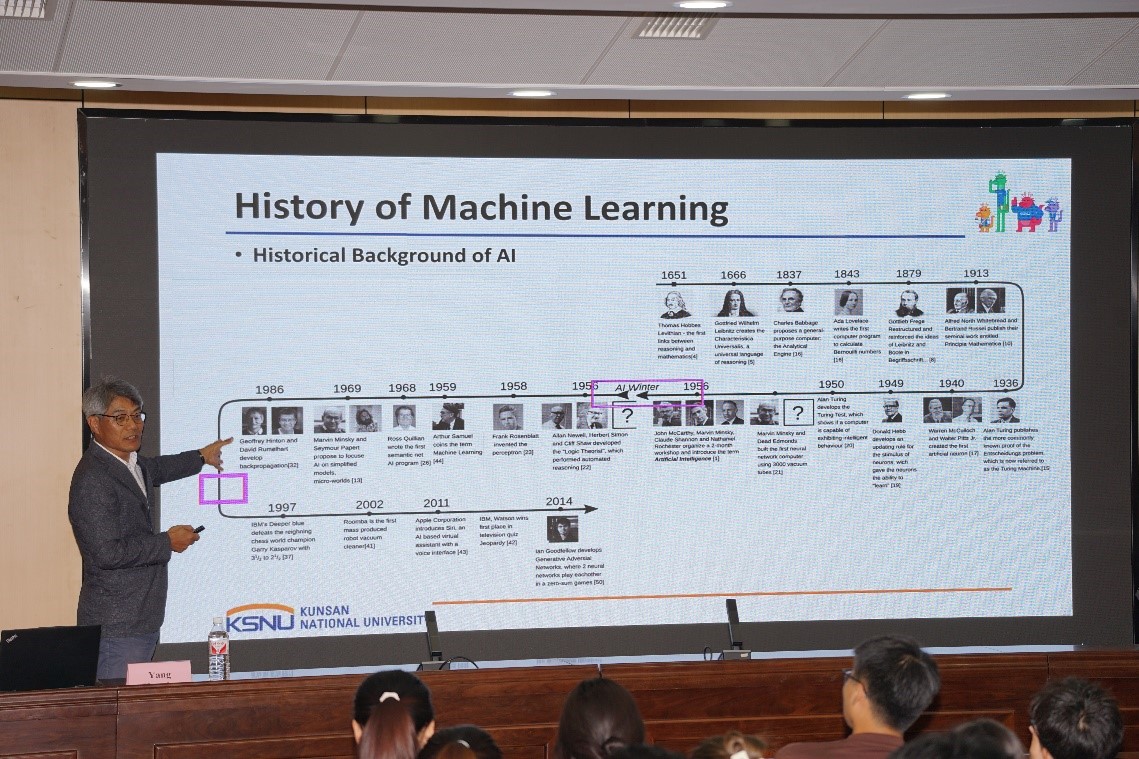 为拓宽学生学术视野,掌握人工智能学科领域的前沿知识,6月20日上午,由yl6776永利集团(人工智能学院)承办的“信智论坛”第十一讲在章丘校区第二学术报告厅举行。韩国国立群山大学计算机软件学院教授、博士生导师Hyunho Yang(梁贤镐) 受邀作了题为《Overview of Artificial Intelligence and Generative AI》的学术报告。此次报告由yl6776永利集团(人工智能学院)副院长秦超主持,学院相关专业师生聆听了报告。