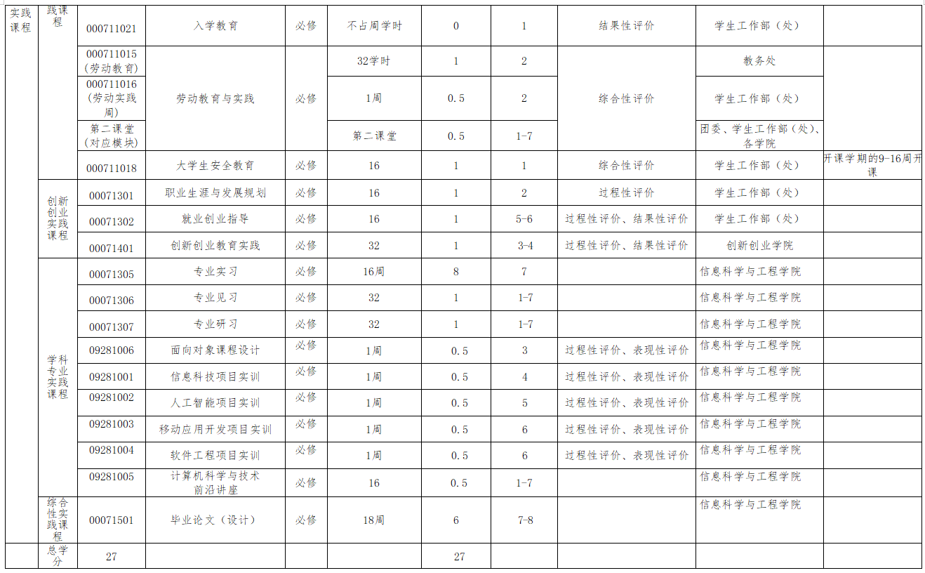 课程实验、课程设计、项目实训、第二课堂、军事理论及训练、职业发展规划与就业指导、劳动教育、专业见习、专业实习、毕业设计(论文)等。