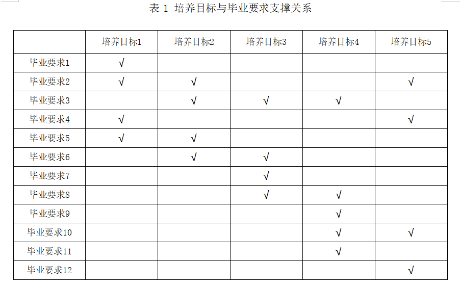 以上 12 个毕业要求对培养目标形成了完整的支撑,通过对毕业要求的分析可有效评价培养目标的达成。毕业要求与培养目标之间的支撑关系如表 1 所示: