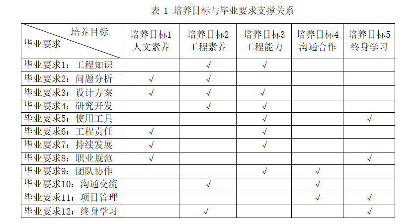 以上 12 个毕业要求对培养目标形成了完整的支撑,通过对毕业要求的分析可有效评价培养目标的达成。毕业要求与培养目标之间的支撑关系如表 1 所示:
