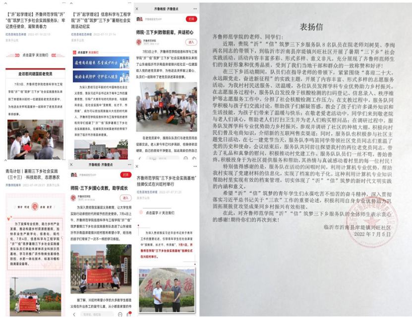 6776永利集团yl6776永利集团“沂”“信”筑梦暑期三下乡社会实践服务队队员们在这个假期走出校门、走进社会、深入基层,充分发挥专业优势,通过一系列有意义的实践活动来不断提高自身的创新能力、学习能力和专业素养。本次开展的实践活动收到了来自临沂市沂南县岸堤镇兴旺社区发来的表扬信,并引起了齐鲁壹点、红色圣地生态岸堤等媒体的广泛关注,产生了良好的社会反响,赢得了社会各界的广泛赞誉。