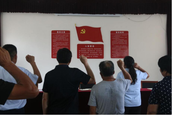 随后,兴旺社区胡书记作为领誓人,带领全体村民党员共同宣读入党誓词。庄严肃穆的氛围,使现场每一位党员再次接受了心灵的洗礼,产生了强烈的共鸣,同时也激励着队员们向党员同志学习。