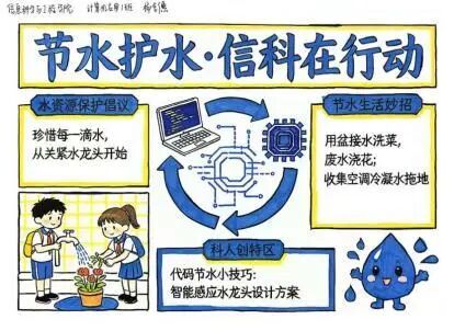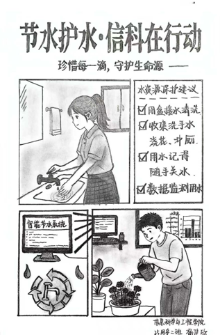 学院以“AI赋能+艺术创作”深化宣传实效,积极响应“人人争当节水大使”号召,同步开展节水主题绘画、海报征集活动。110余名信科学子以笔墨为媒,以算法为桥,将惜水、爱水、护水的理念融入创作,既有手绘海报传递节水温度,更有AI生成节水视觉设计等数字作品,彰显了人工智能专业特色与科技担当。经遴选,共评出39份优秀作品,主题鲜明、形式鲜活,兼具思想性、艺术性与科技感,生动展现了信科学子积极向上的精神风貌与节水护水的责任意识,进一步营造了“人人关注节水、人人以智护水”的浓厚氛围,让节水文化浸润校园、滋养心灵。