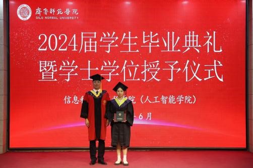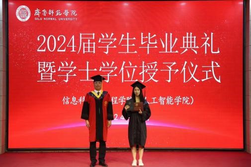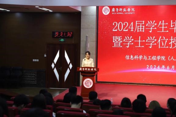 毕业生代表宋宵瑜深情地引领我院学子穿越时光,重温大学的青春岁月。从最初的懵懂与无知,到如今的成长与成熟,每一步都镌刻着信科独特的印记。宋宵瑜结合自己的亲身经历,讲述了在信科的点滴时光,那些如春风化雨般的温暖教育,不仅滋养了学子的知识之树,更滋养了他们的心灵。这种力量,源于信科对于教育事业的执着追求,源于那份深沉的家国情怀,它像一座灯塔,照亮了我院学子前行的道路,推动着他们不断向前。