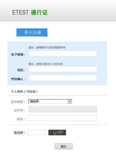 2) 出现“考生登录”页面后,若已经注册过“ETEST 通行证” 的可直接登陆;若没有注册“ETEST 通行证” 的,则点击“ 点击注册”