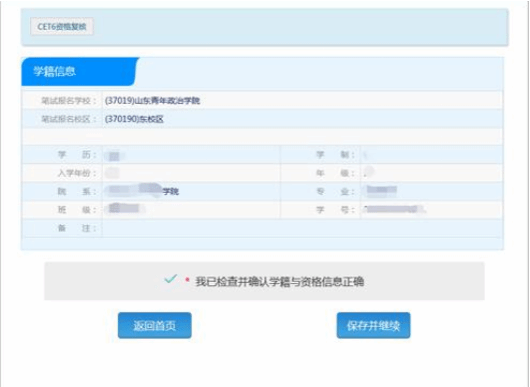 6) 查询后出现资格信息确认网址,仔细确认好自己的有关信息后,点击“保存并继续”。