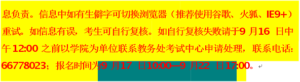 (三)我校四六级考试报名时间:2025年9月17日10:00—2025年9月22 日17:00。网上缴费时间:2025年9月17 日10:00—2025年9月23日17:00。请务必在此时间段内报名,逾期将无法报名参加考试。