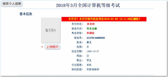 注意:考生应在规定时间内上网填报、修改及查询本人信息,填报完毕未确认信息的考生,系统将在 24 小时后自动删除。填报过程包括登录、查看提示信息、输入并提交保存。修改和查询与填报过程相同。考生要认真填写、核对本人信息,并对自己所填报的各项信息准确性负责。姓名、地名等信息项中如需填写软件系统字库中没有的汉字, 以拼音全拼(半角大写字母)代替。