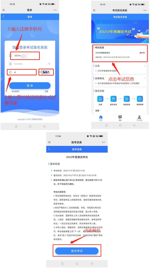 输入注册手机号、密码进入系统,点击“2025 年普通话考试”,进入报名信息页面查看考试注意事项,然后点击 “报名考试”,进入信息填报页面。