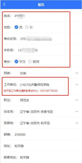 报名页面,红框标记的姓名、性别、身份证号、手机号、工作单位等信息为系统匹配数据无需更改,填写其它信息后,信息审核无误点击提交按钮,报名成功后等待管理员审核。