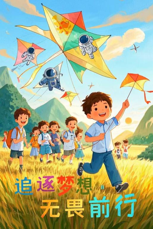 这幅插画以充满活力的户外场景为背景,展现了一群孩子在金黄草地上放风筝的画面。色彩明亮轻快,蓝天、青山与草地相互映衬。风筝上绘有宇航员等元素,富有童趣与幻想色彩。文字“追逐梦想 无畏前行”点明主题,传递出鼓励人们勇敢追求梦想,不惧困难、奋勇向前的积极精神 ,整体营造出纯真、励志且充满希望的氛围。