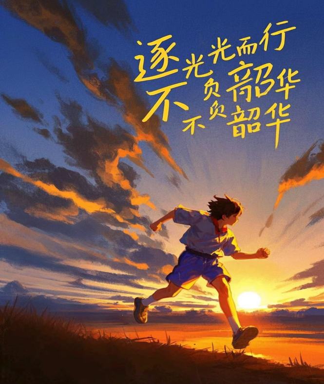大家好,我创作这幅画时,脑海中浮现出少年逐梦的模样。夕阳象征希望与美好,少年奋力奔跑,代表着对理想的执着追寻。“逐光而行,不负韶华” 是想传递给大家的信念,愿我们都能在有限时光里,向着光的方向,无畏前行,不辜负每一份拼搏的力量。