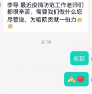 “作为新时代的青年,我们应该挺身而出、承担责任。一方有难,八方支援。作为疫情防控志愿者,我们要积极配合学院开展加强疫情防控教育、安抚隔离同学心理,为攻克战“疫”打下坚实一步。在学院疫情防控形势严峻的当下,需要更多力量加入防疫的队伍,需要我们每一个人的努力。”