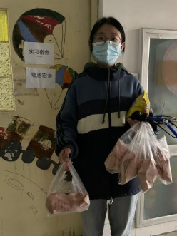 “我会每天按时抵达集合地点,为隔离宿舍提供送餐后勤服务、帮助他们拿取快递、购买生活必需品等;为进一步降低安全隐患,我们采取的是“无接触式”服务;我们也会通过微信、电话询问隔离同学的身体和生活情况,及时了解各类需求,并在精神上进行鼓励支持,帮助排解他们的身心压力。同时,我们还帮忙给各班发放隔离防护用品,并提醒同学们做好防护工作;安排专门人员不定期对隔离宿舍进行消毒,时刻掌握隔离人员身体情况。”