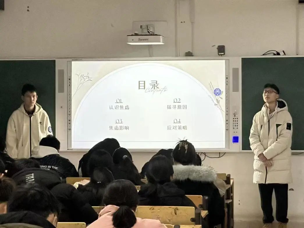 宣讲团本次的宣讲主题是轻卸焦虑,心向暖阳。宣讲团从四个方面为同学们讲解,分别是认识焦虑,探寻原因,焦虑影响以及应对策略。