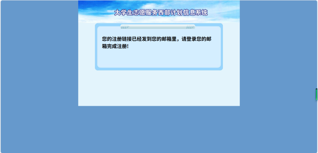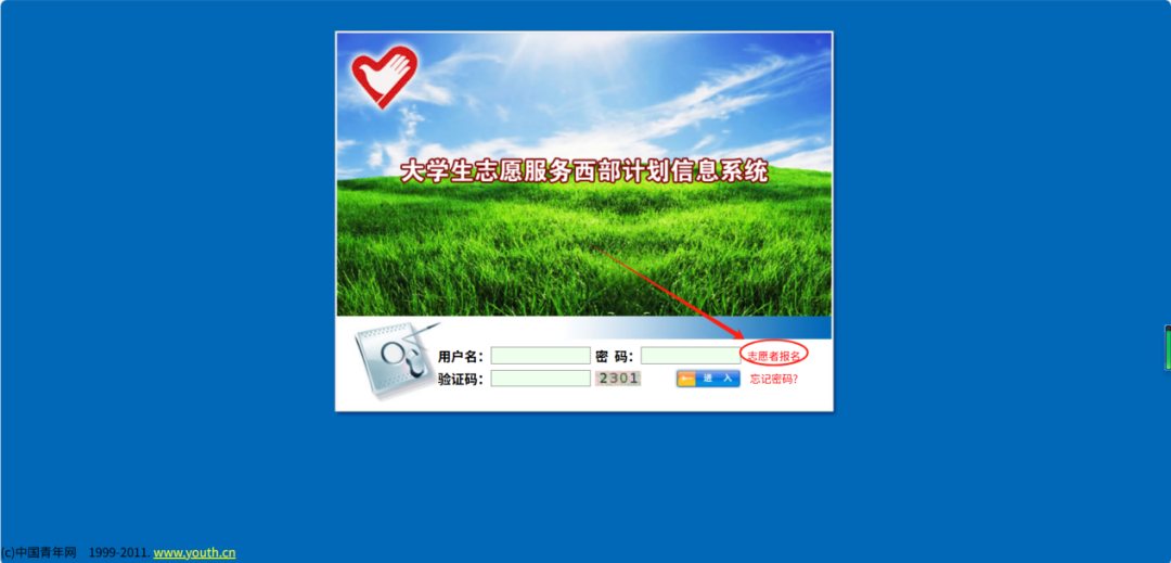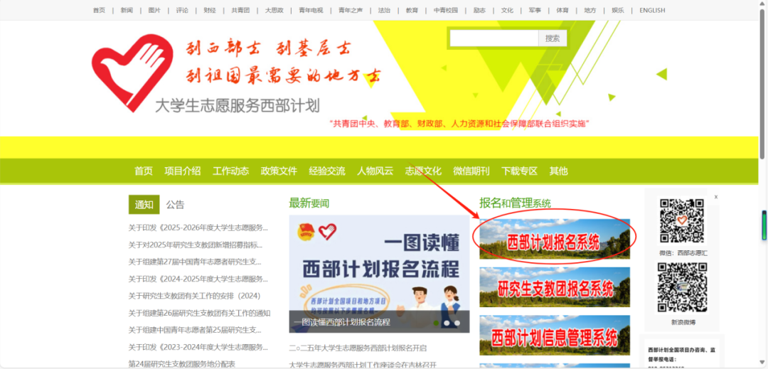 1、登录西部计划官网(http://xibu.youth.cn)点击首页右侧的“西部计划报名系统”。