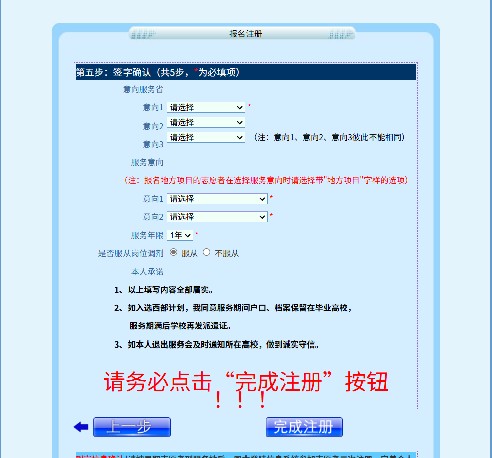 9、选择岗位:选择服务意向,可从8个专项中勾选服务方向,并优先填报意向服务省份,同时选择服务年限,点击“完成注册”。