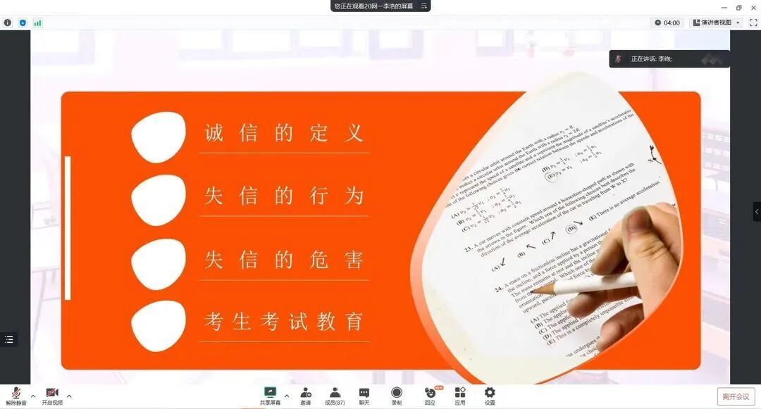 李绚老师在班会中强调,考试凭实力是自信者的姿态,考试靠作弊是怯懦者的失败。诚信是道义,也是责任。遵守考纪,诚信应考是每一位学生的责任,这是对自己负责,更是对道义的守护。作为即将步入社会的应届毕业生应该知道,社会需要拥有高尚品格的人。“文明考风、诚信考试”,每一名同学都要自觉抵制作弊行为,守住内心的一份坚持,交出一份合格的答卷,做一名文明诚信的大学生。