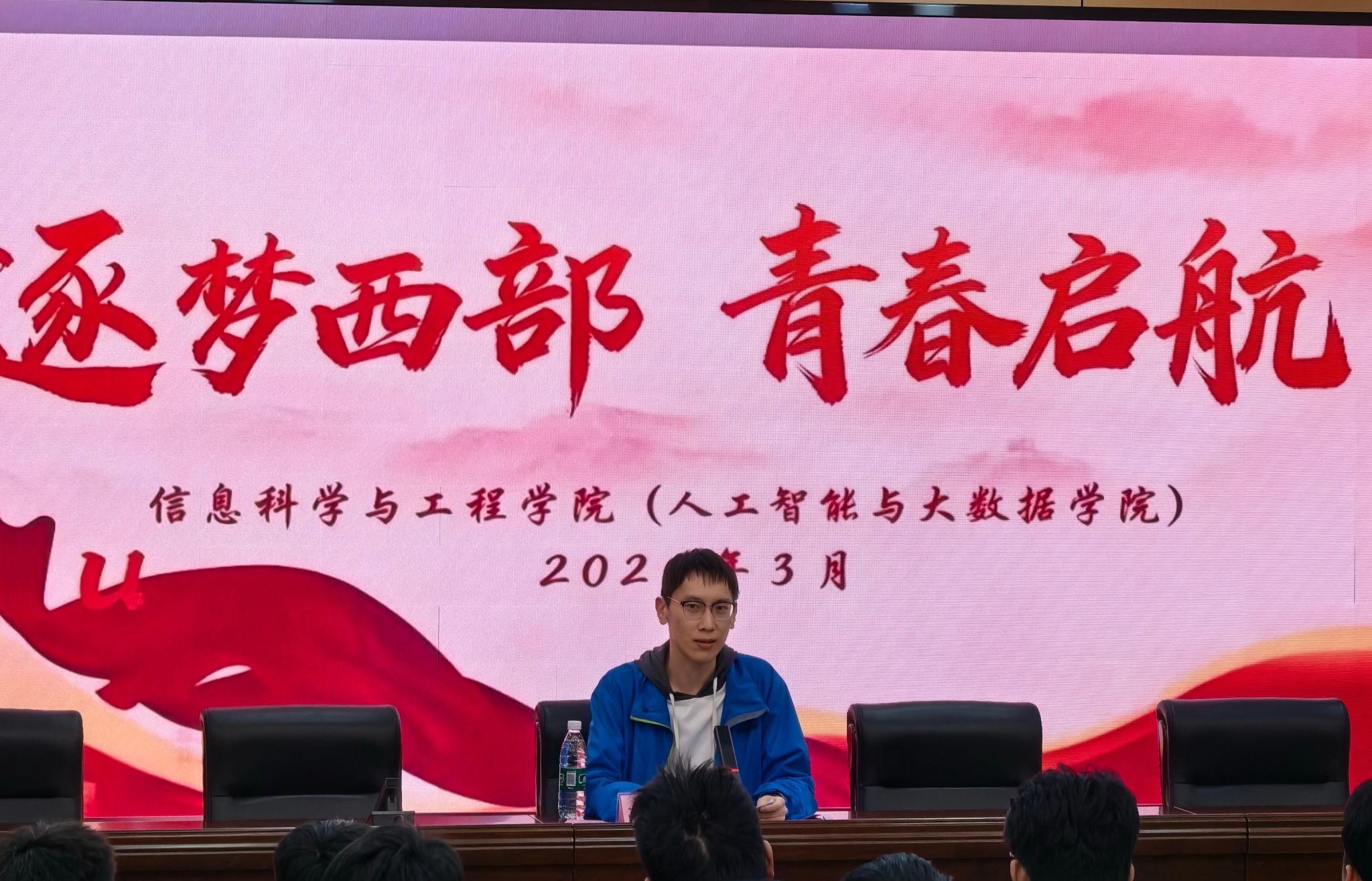 本次讲座特邀化学与化工学院高可攀老师担任主讲人。高可攀老师于2021年主动参与大学生志愿服务西部计划,在新疆喀什地区团委担任志愿者总联络员,拥有丰富的基层志愿服务经历,是当代青年扎根西部、服务人民的生动典范。讲座中,他结合自己在喀什的亲身经历与真切感悟,用鲜活的事例、真挚的情感,生动讲述了在西部基层服务群众、挥洒汗水的奋斗故事,全面展现了新时代大学生志愿者扎根边疆、无私奉献、不负韶华的精神风貌,让在场学子深刻感受到西部基层的广阔天地与青春价值。