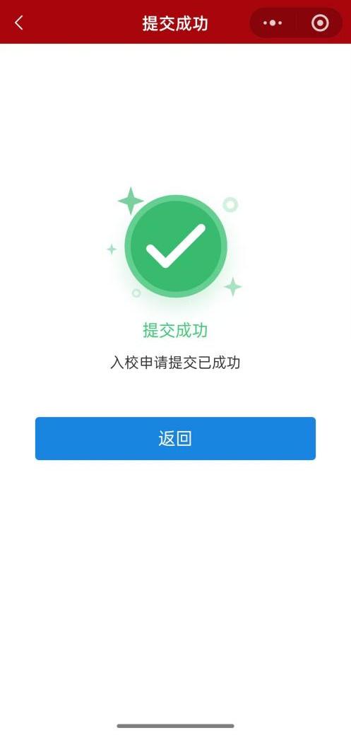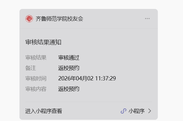 3.提交访客申请后,等待管理员审核,审核通过后,系统会通过短信或小程序消息推送通知申请人,申请人可在小程序“我的”板块中点击“我的返校预约”中查看预约状态。