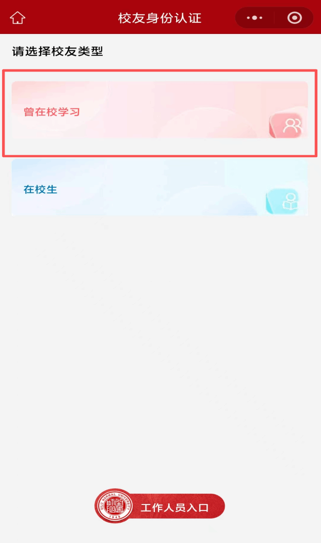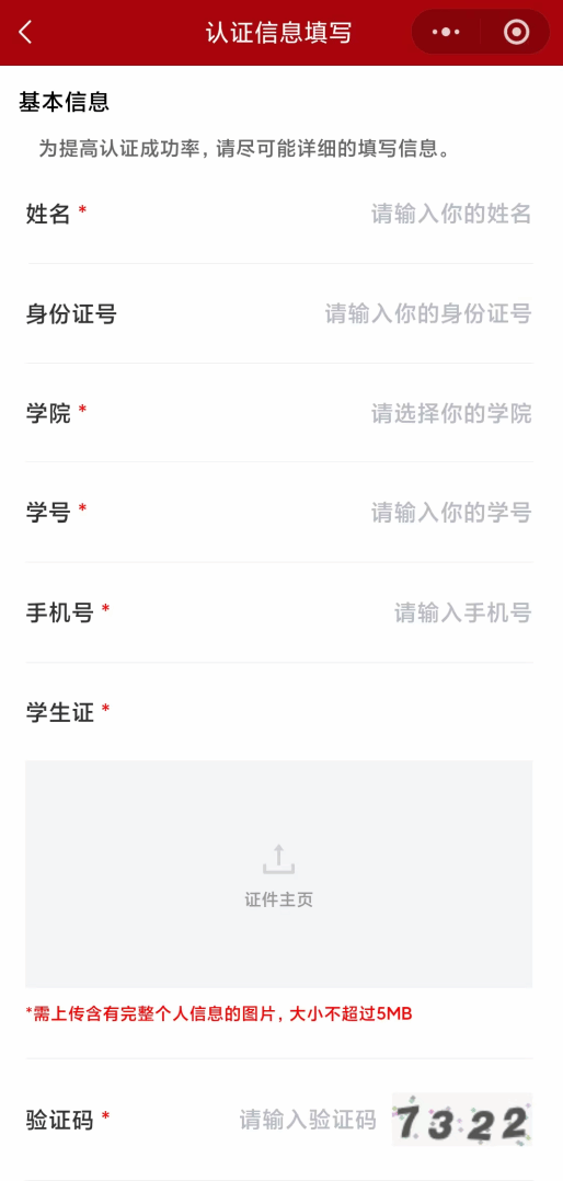 1.首次进入小程序需要先进行身份信息登记,进入登录界面后根据个人在校情况点击“曾在校学习”/“在校生”按钮填写个人信息(姓名、身份证号、学院、学号、手机号、毕业证/学生证)。系统会自动完成身份核验,未核验通过的需要等待人工审核。