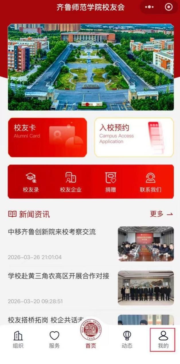 2. 进入小程序后,点击右下角“我的”进行校友卡注册。