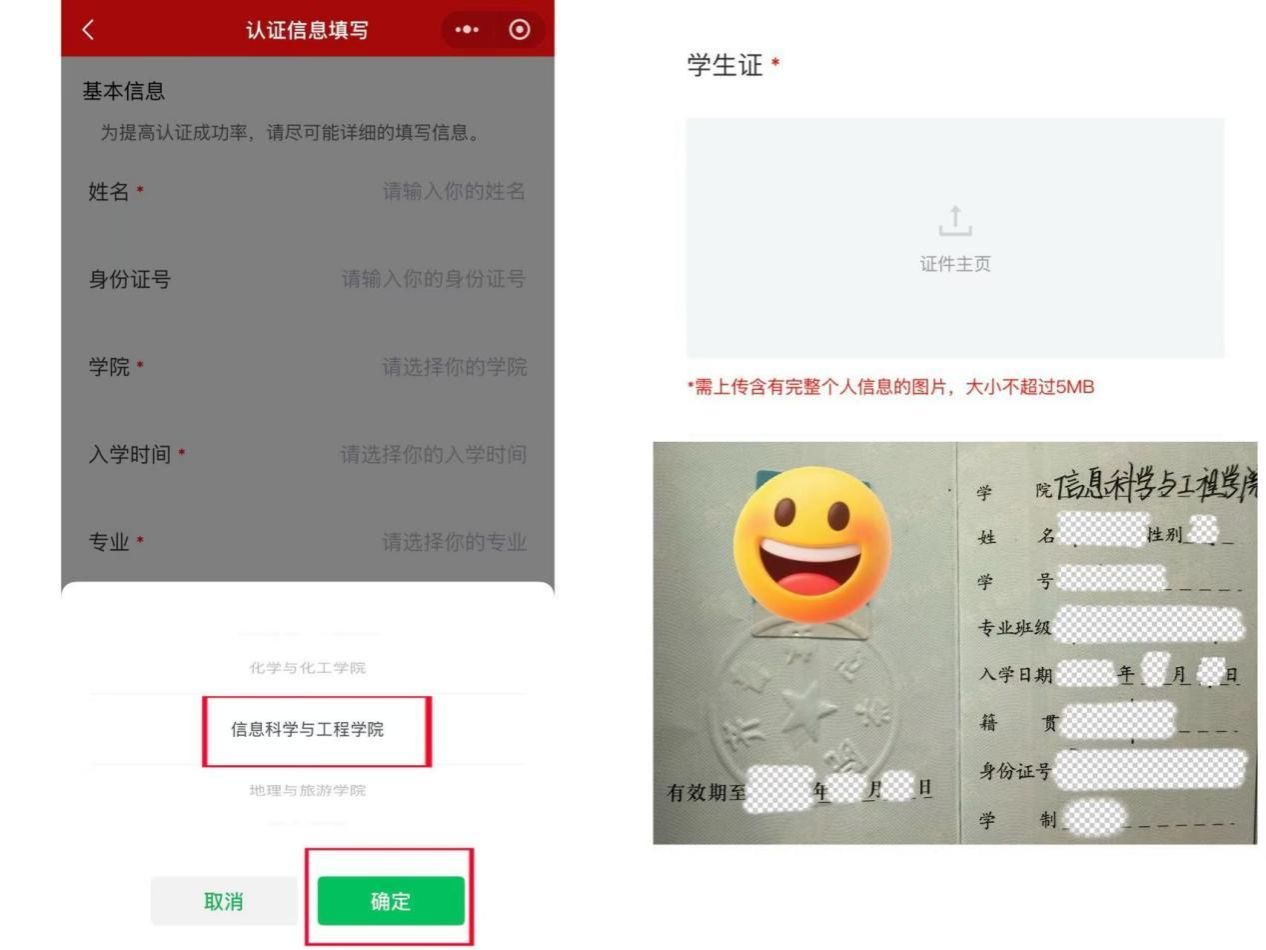 2.选择学院时,上下滑动找到自己所在学院,如下图中“yl6776永利集团”,停留在该处,点击“确认”即选择成功。若上传学生证/毕业证,请上传下图学生证中含有完整个人信息的图片(毕业证同上)。