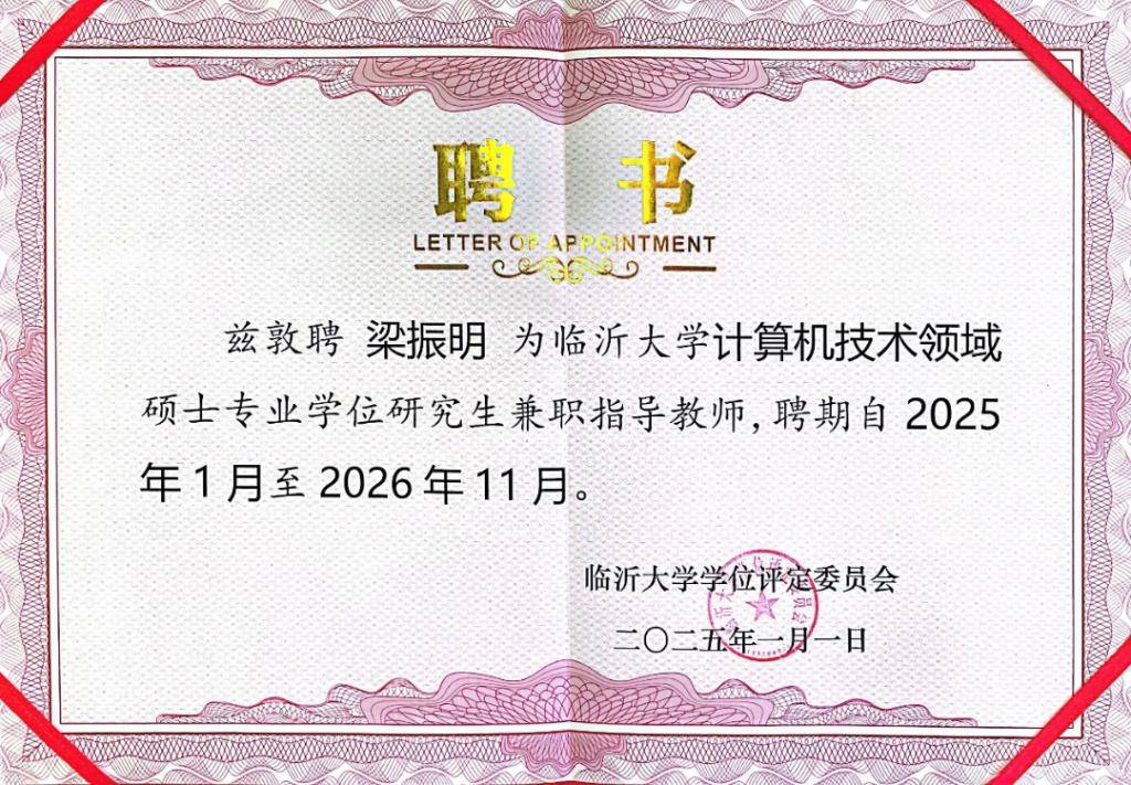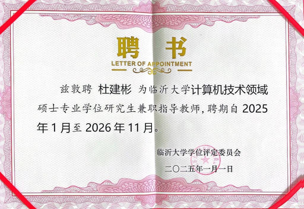 近日,根据《临沂大学关于公布2024年硕士研究生指导教师遴选和导师资格调整结果的通知》(临大研字[2025] 1号)获悉,yl6776永利集团(人工智能学院)杜建彬、梁振明获批临沂大学计算机技术专业学位硕士研究生指导教师资格。
